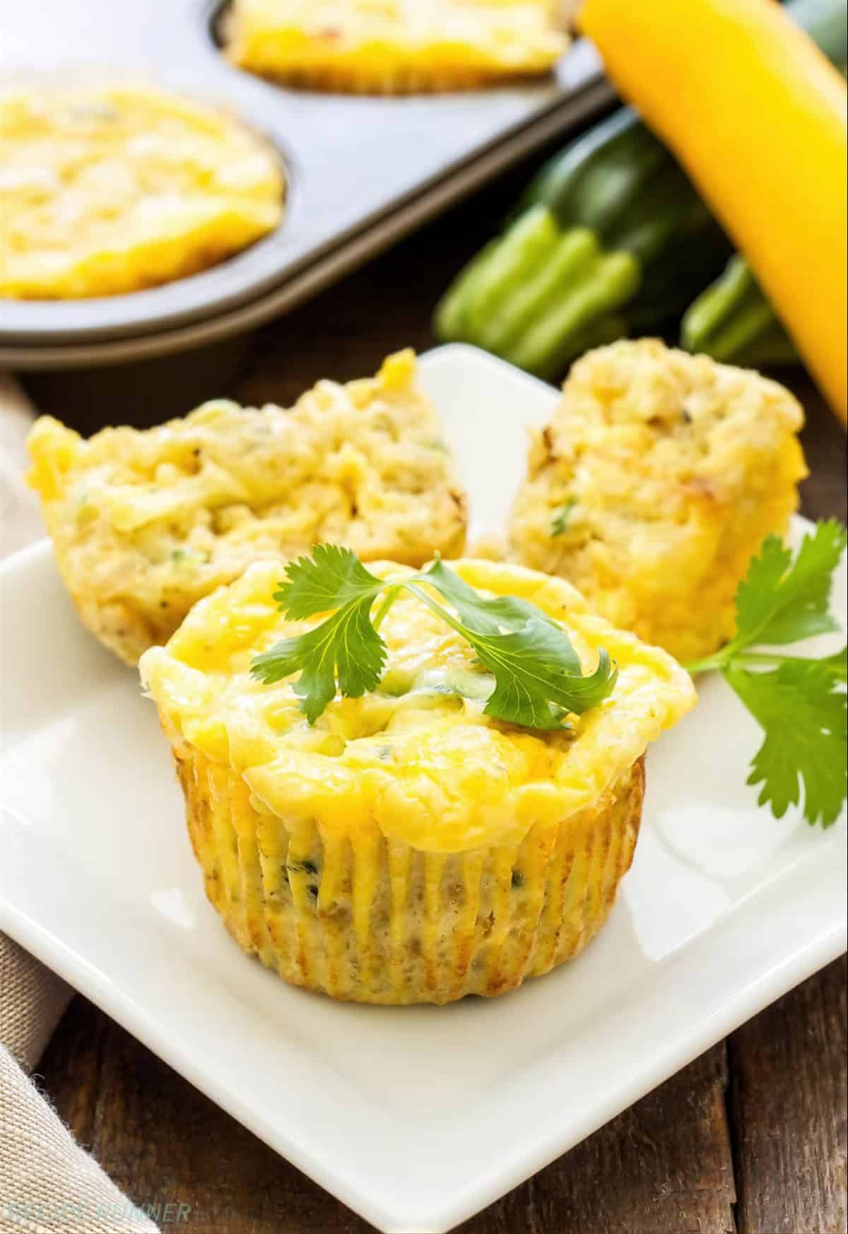 Cheesy zucchini quinoa egg muffins baked in a muffin tin with melted cheese on top served on a white plate